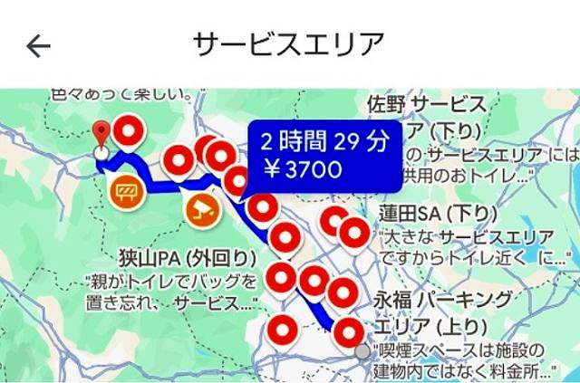 Googleマップでは、高速道路を利用する際に簡単にサービスエリアを探せます。