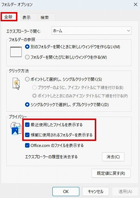 以下のように、「全般」タブのプライバシー設定で、「最近使ったファイルを表示する」、「よく使うフォルダーを表示する」にチェックが入っているかを確認します。