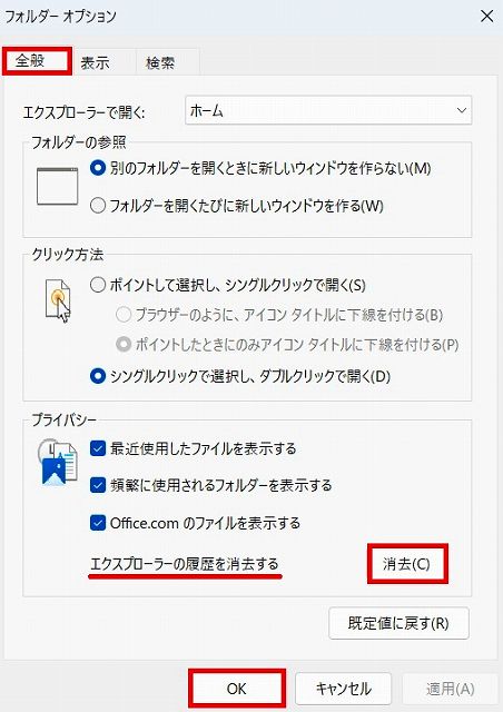 この場合、フォルダーオプションの「全般」タブから、「エクスプローラーの履歴を消去する」右横の「消去」→「OK」ボタンを押します。